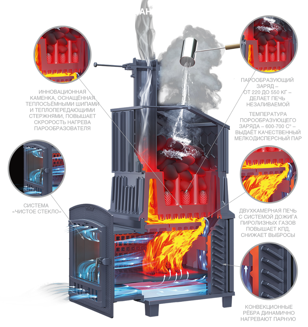 Печь Гром с уникальной каменкой прямого нагрева для получения легкого мелкодисперсного пара, необходимого для режима русской бани. Благодаря инновационной конструкции, печь гарантированно входит в режим за 40 минут.