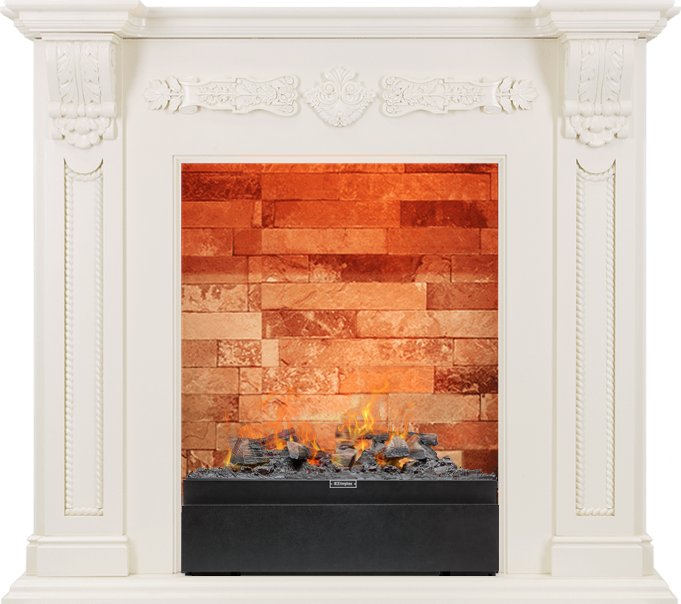 Портал представлен в цвете слоновая кость. Узкая столешница и пьедестал добавляют ему изящности, узкие колонны с резным орнаментом красиво обрамляют зону очага.