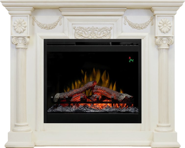 Обрамление для камина сделано из высококачественных материалов. Резной декор украшает фронтальную поверхность портала, а зона очага обрамляется изящными колоннами.