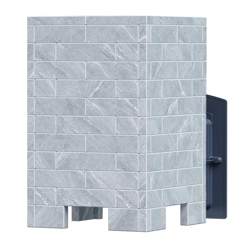Форма куба и отсутствие отдельных опор на нижнем ярусе обеспечивает устойчивость на подиуме, а прочные крепления из алюминиевого сплава исключают расхождение плит. Перекрытие облицовки выполнено из 2-х плит так, чтобы отверстие под выход дымохода находилось между плитами и давало возможность проводить монтаж с уже установленным дымоходом без дополнительного демонтажа. Расположенные по краям облицовки заливные горловины для поддачи воды декорированы каменными хомутами, которые могут быть выполнены в цилиндрической или восьмигранной форме по Вашему выбору.