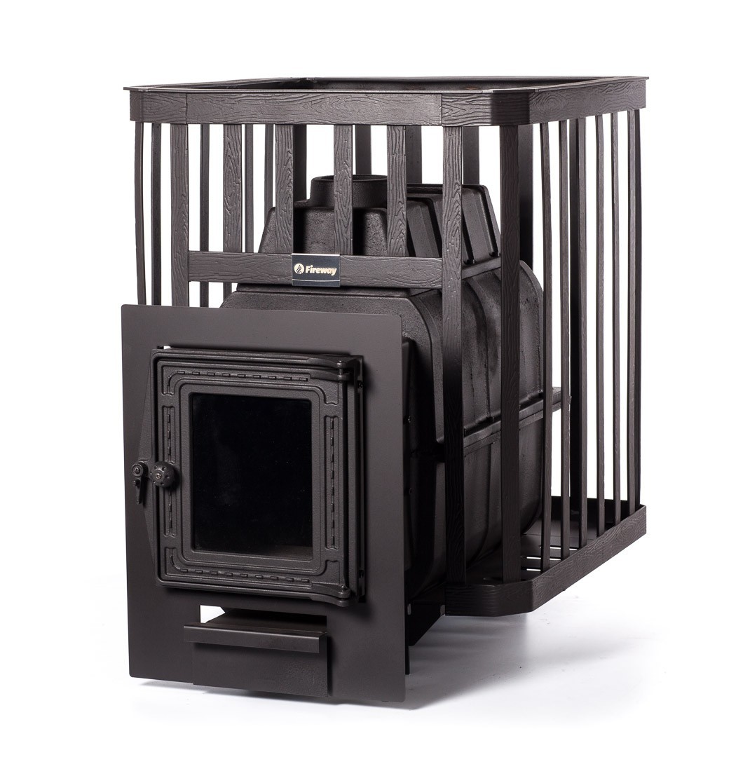 Печь предназначена для отопления парильных помещений 14-24 куб. м. Топка печи чугунная. Каменка в виде сетки из кованной стали. Выносной канал 20 см для топки печи из смежного помещения. Топочная дверца чугунная стандартная К201 Fireway, размер 290х297 mm. Загрузка дров фронтальная. Диаметр дымохода 115 мм. Расположение дымохода сверху. Отделка антрацит. Размер стекла 225х190х4 mm. Гарантия 3 года.