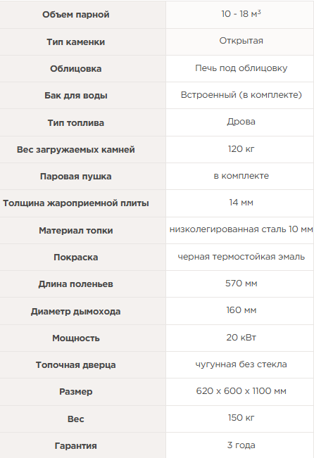Объемная, не вентилируемая каменка позволяет получать большое количество пара, толстый металл топки и дымовых каналов обеспечит высокий ресурс печи (более 15 лет).