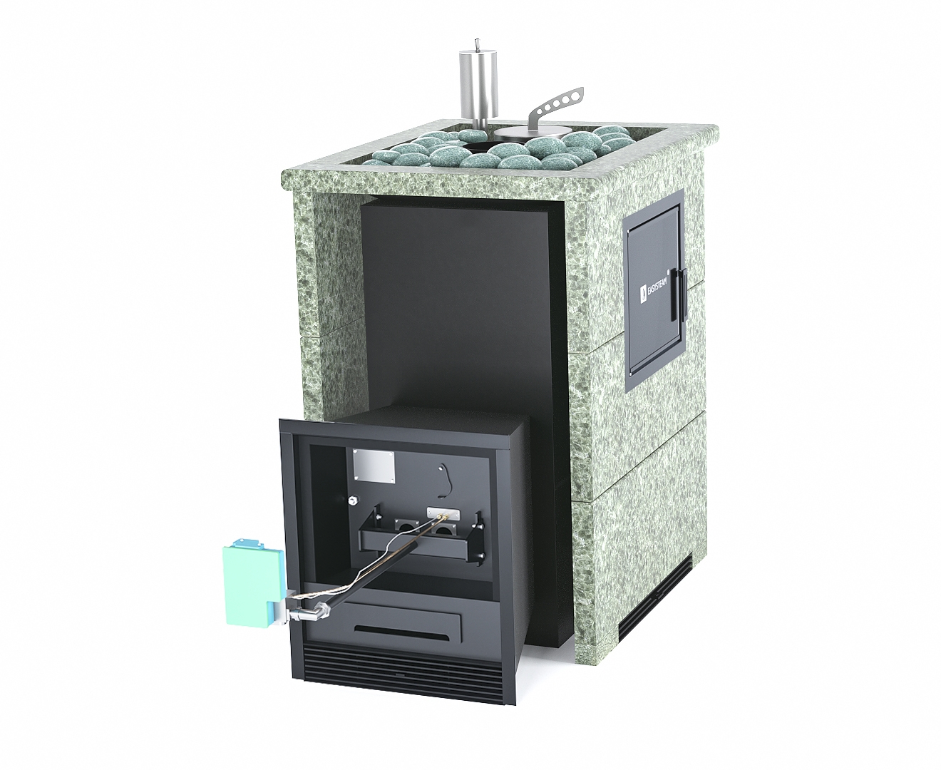 - Печь Анапа М2 в трехстороннем кожухе с открытым верхом - Варианты кожуха - Талькохлорит, Марка стали - AISI 321, Боковой вход в каменку - С тыла, Защита топки - Футеровка, Вид топлива - Газ Комплектация с САБК-40