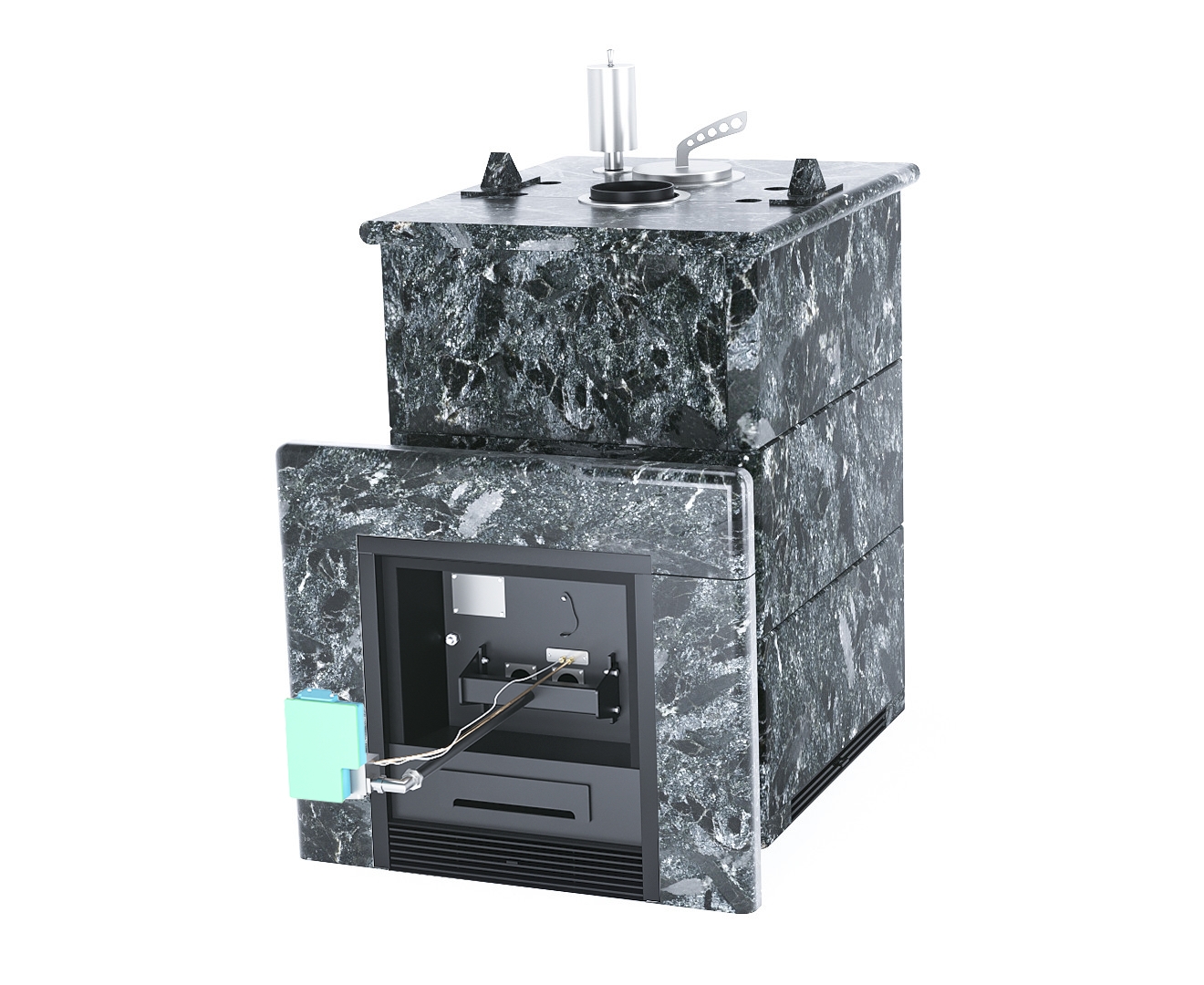 - Печь Анапа в полноценном кожухе с закрытым верхом - Вид топлива - Газ Комплектация с САБК-40, Варианты кожуха - Талькохлорит, Защита топки - Защ. экраны, Марка стали - AISI 430