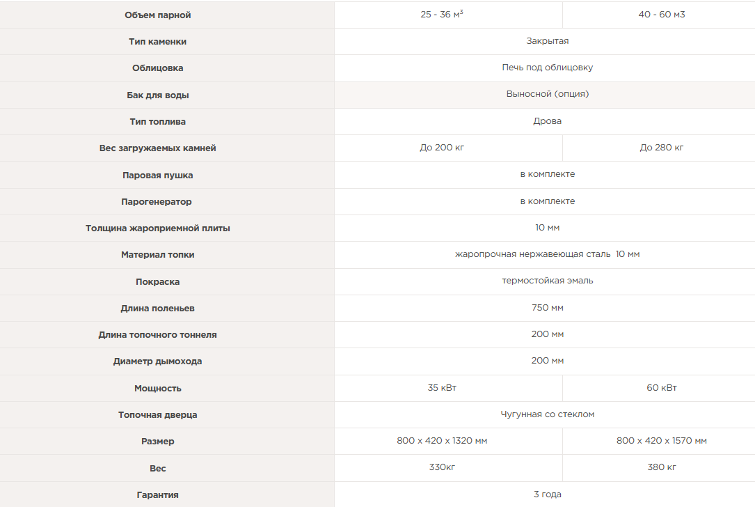 Возможности: Печь предназначена для классической русской парной с закрытой каменкой по-серому. Позволяет получить мягкий пар русской бани. Климат в парном помещении максимально приближен к климату с кирпичной печью. Время топки 2 - 2,5 ч.